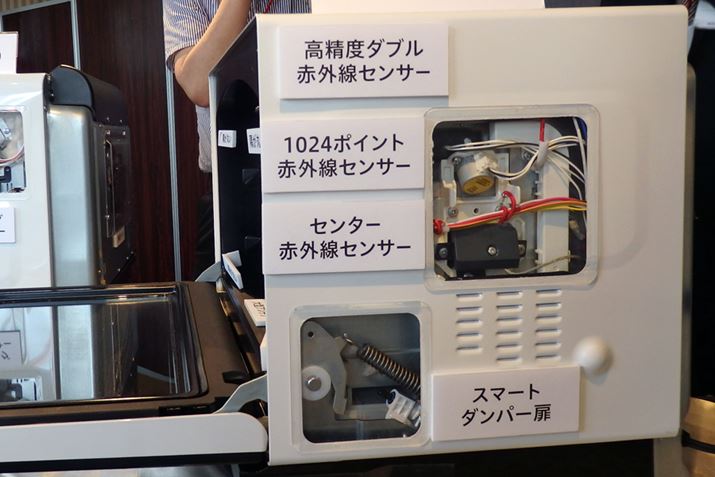 オーブンレジンにある機能の中でもっとも使用頻度が高いであろうレンジも大きくリニューアル。レンジでの温めの場合に、その精度を左右するセンサーが改良された。ER-PD7000では、庫内をスイングしてセンシングする「1024ポイント赤外線センサー」と庫内の中央部分を連続的に見張る「センター赤外線センサー」という2つのセンサーを組み合わせて温度変化を感知。これにより、少量の解凍やスピーディな解凍ができるようになったという。