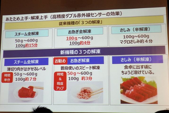 新しいセンサーにより、搭載されている解凍モードの運転時間が短縮。冷凍した薄切り肉がはがせる程度に解凍する「スチーム全解凍」では、2015年度モデルよりも100gの解凍時間が8分も短くなった