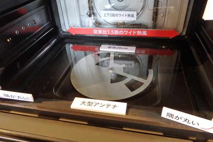 庫内の底にあるマイクロ派を発生させるアンテナは、従来よりも5cm大型化することで広範囲を加熱できるようにした