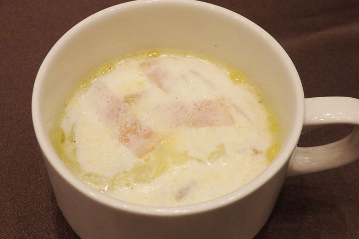 耐熱ボウルに食材を入れレンジ加熱して作ったスープは、具材のキャベツ、しめじ、玉ねぎにしっかりと火が通っていながらもシャキシャキ! 鍋で作るより簡単でおいしいかも♪