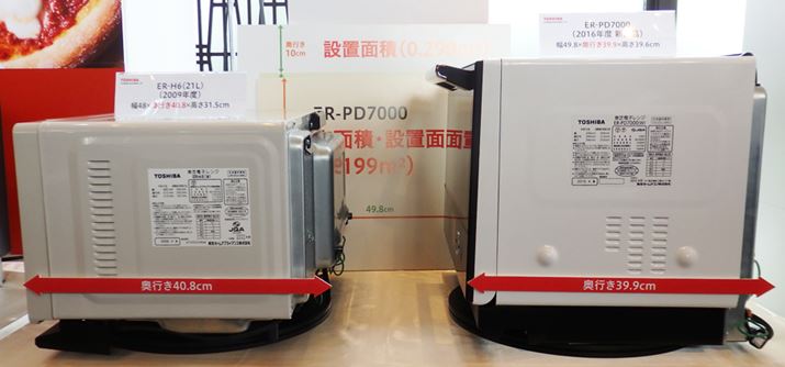 8年前に発売された庫内容量21Lのオーブンレンジ(左)よりも、庫内容量30LのER-PD7000のほうが奥行は小さい。設置スペースに高ささえあれば、ためらわず買い替えできそう