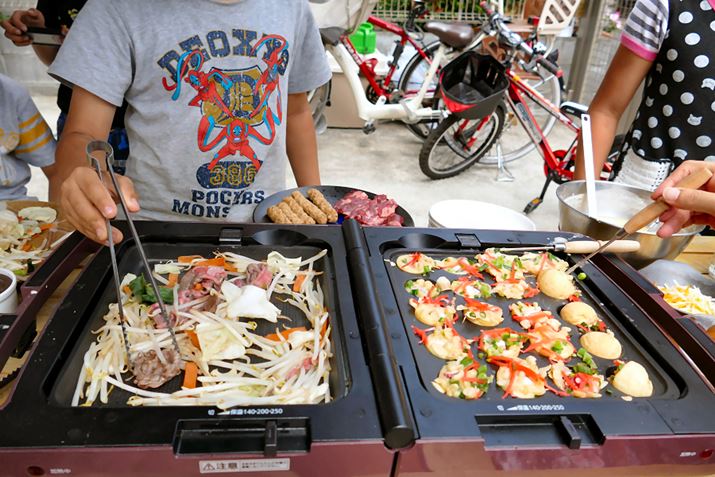 さっそく庭のキャンプテーブルで、子どもたちを呼んで「たこ焼きパーティ」をすることにしました! 「たこ焼きプレート」でたこ焼きを、平面プレートで「焼き肉」をします。
