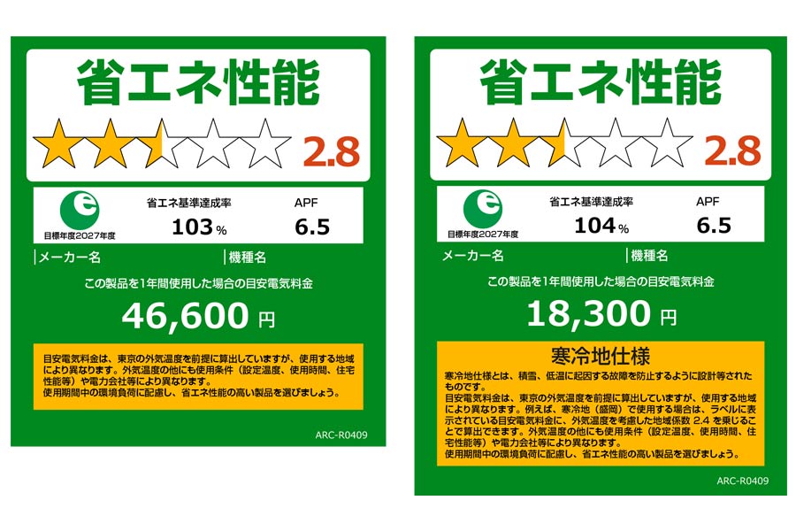 月々の電気代に直結する「省エネ性能」も忘れずにチェック。手っ取り早いのが、各モデルに付いている「統一省エネラベル」です。省エネ性能を示す多段階評価点や、年間のおおよその電気代などが表示されています。多段階評価点は3.0以上だと省エネ性能が高いと言えます。