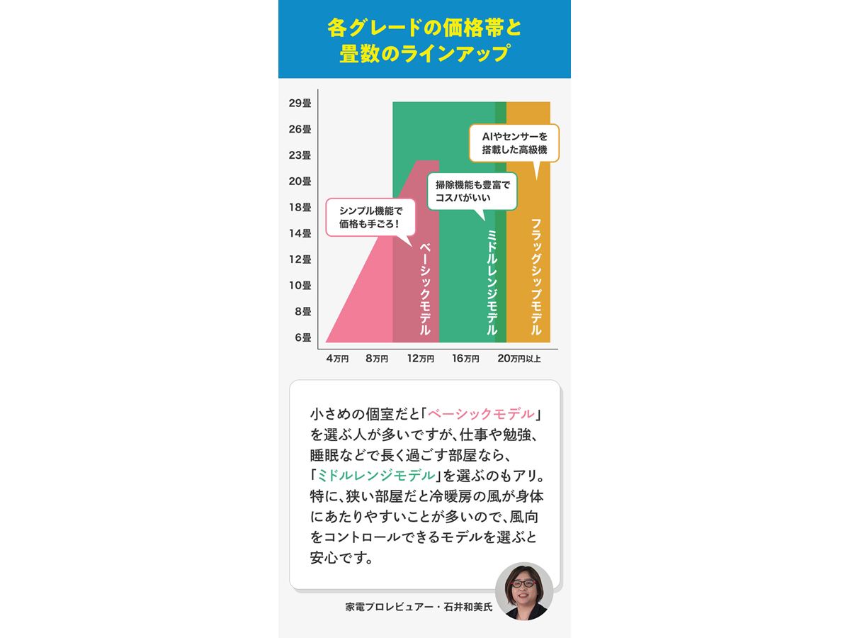 エアコンは、設置する部屋の広さや、搭載されている機能によって、本体価格が大きく異なります。そこでまずは、各メーカーが展開している“グレード”の違いに着目。「フラッグシップモデル」「ミドルレンジモデル」「ベーシックモデル」の3つに分け、それぞれの特徴や価格帯、対応する部屋の大きさなどを紹介します。