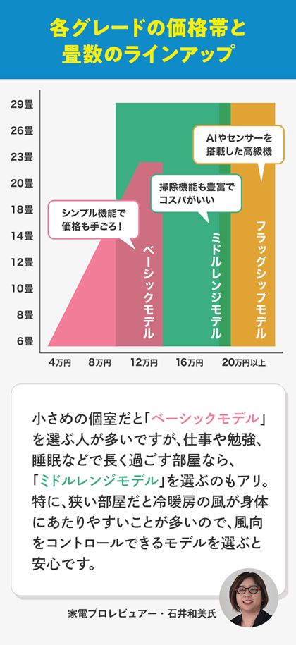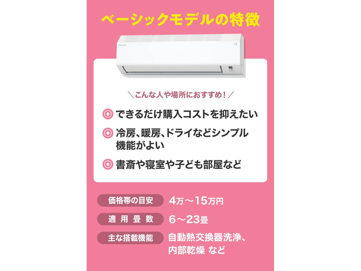 「ベーシックモデル」は、搭載機能がシンプル。対応する部屋の広さは6〜18畳くらいが中心で、お手ごろな価格のモデルが多いのが特徴です。