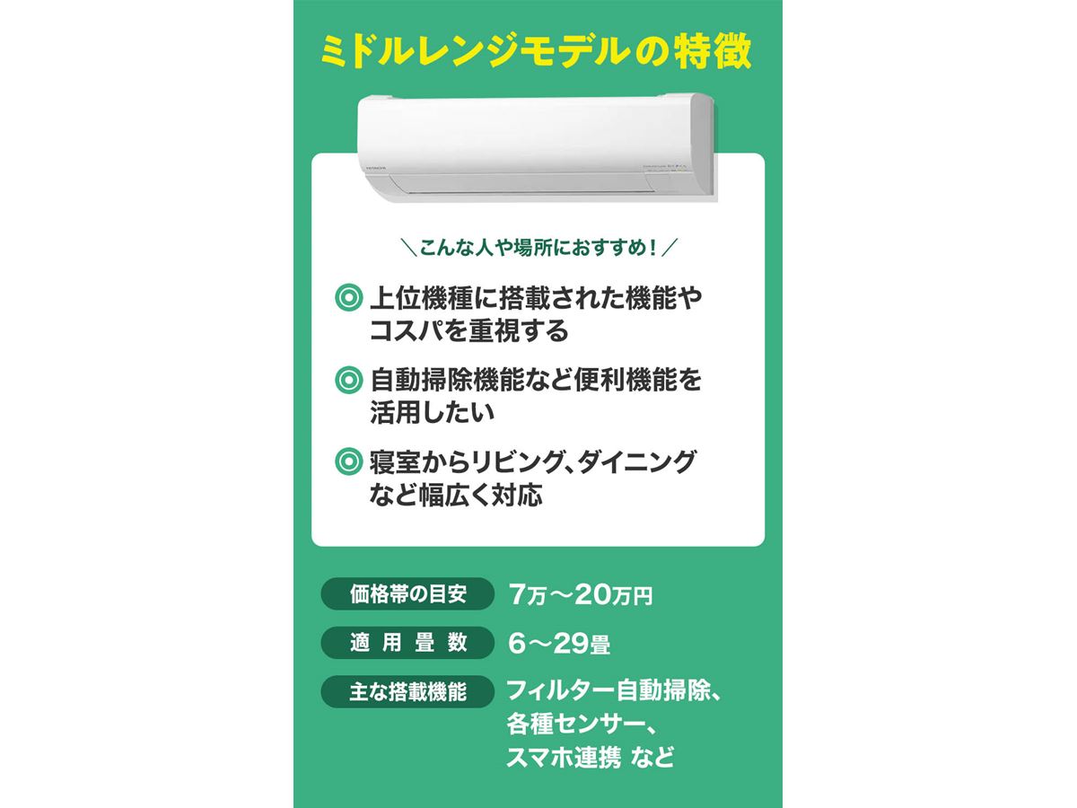 「ミドルレンジモデル」は、エアコン内部の自動掃除機能が搭載されているなど、お手入れの手間があまりかからないモデルが多め。また、対応する部屋の広さも「ベーシックモデル」より多いのが特徴です。