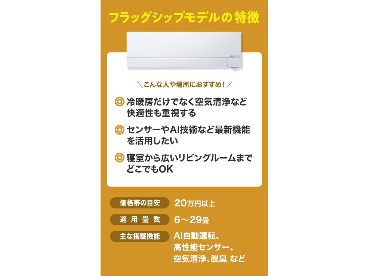 「フラッグシップモデル」は、各メーカーの最上位モデル。最新のAIセンサー機能など、快適性にこだわった機能が豊富です。そのため、本体価格は20万円以上の高額なモデルが多いです。