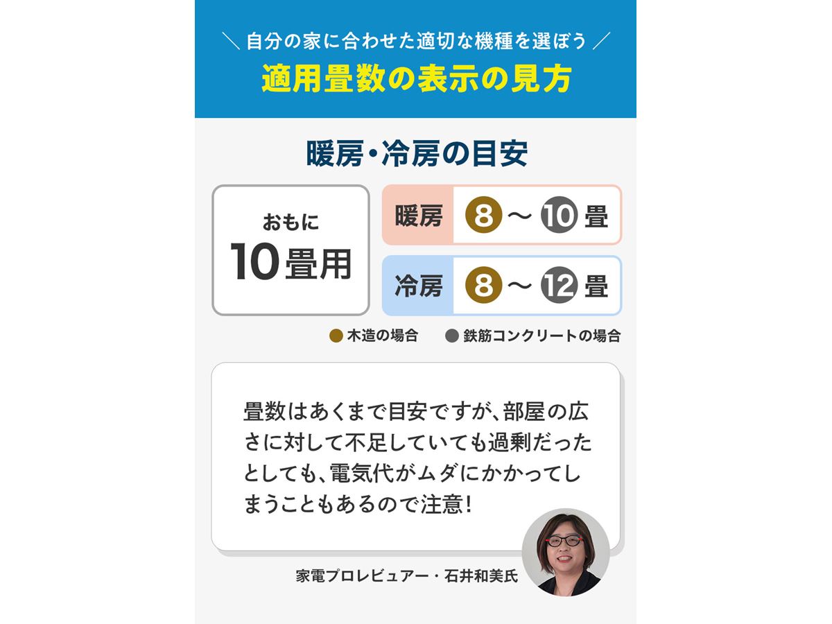 エアコン選びのポイント2つ目は、設置する部屋の広さに応じた製品を選ぶこと。エアコンにはモデルごとに、どの程度の広さの部屋に適しているかを示す目安の数値「適用畳数」(畳数の目安)が設けられており、設置する部屋の広さ(畳数)と合ったモデルを選ぶことが重要です。