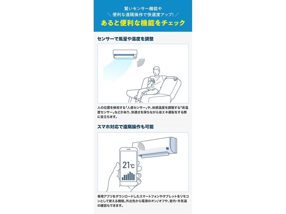 最上級モデルらしく高機能が満載で、設定温度に達した後も蒸し暑さを感じにくくさせる「プレミアム冷房」や、AIが好みの運転パターンを学習して最適に運転する「AI快適自動運転」などを搭載し、快適な部屋を実現します。
