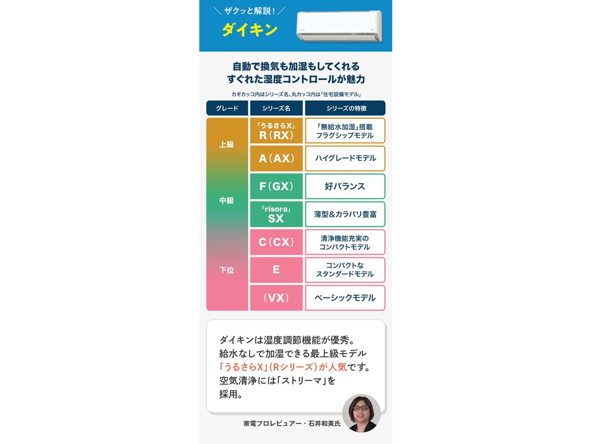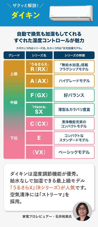 赤外線センサー「ムーブアイ」が床や壁から体感温度を測り、快適な室温に保ってくれるのが特徴。「FLシリーズ」はカラバリが豊富なスタイリッシュモデルで、「Xシリーズ」は機能と価格のバランスがいいモデルです。