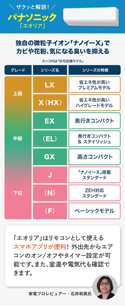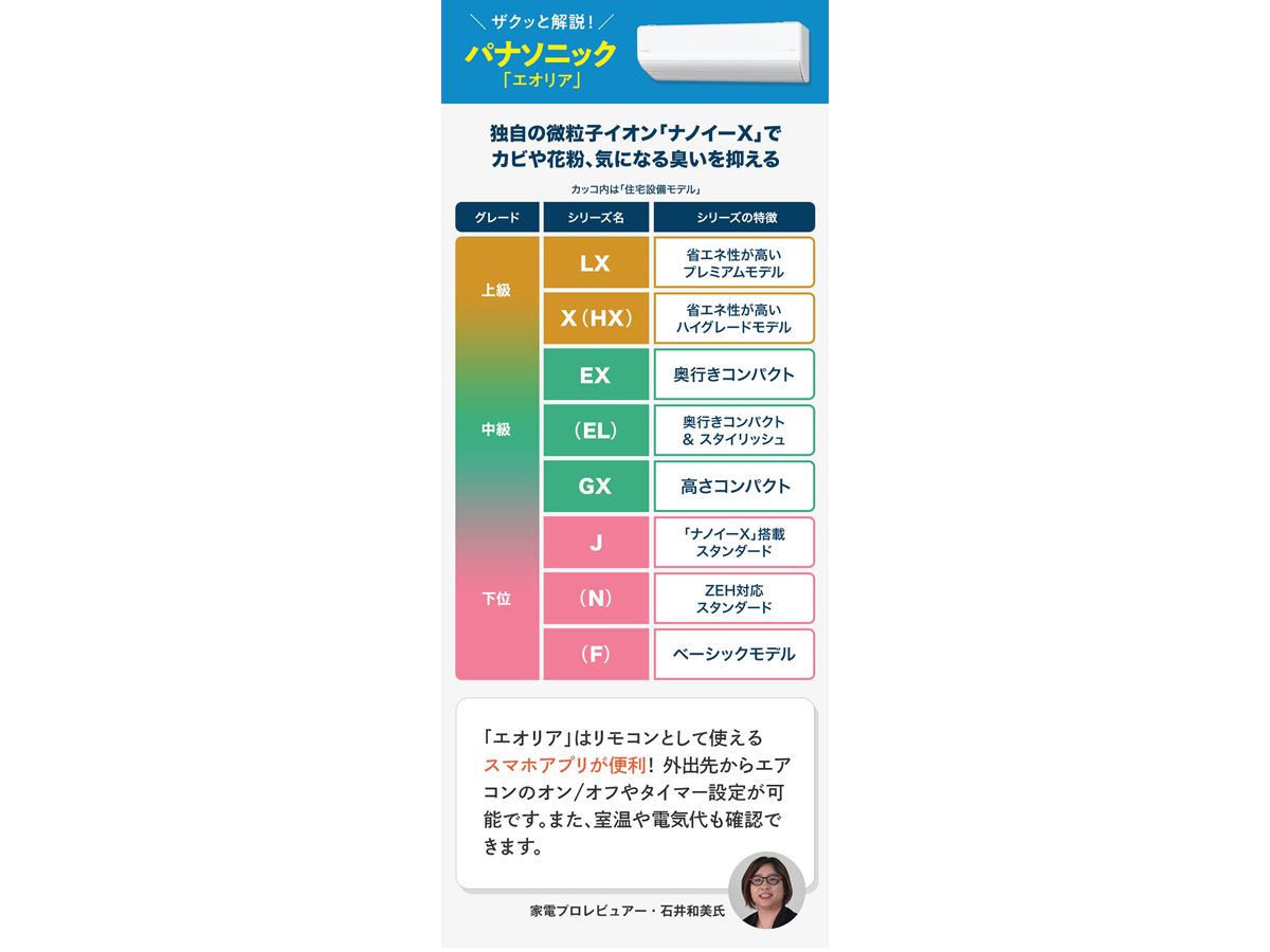 パナソニック「エオリア」の 「GXシリーズ」は、本体の高さが249mmとコンパクトなシリーズで、窓上のすき間が少ない場所でも設置しやすいのが特徴。