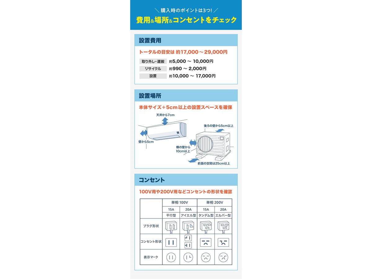 続いてチェックすべきポイントは、エアコン本体(室内機)と室外機の設置スペースです。室内機は設置の際、天井から7cm以上、左右の壁からも5cm以上のスペースが必要。室外機は、前方25cm以上、左右10cm以上、後方5cm以上のスペースが必要です。環境によって室外機を置けない場合は、別途設置工事などが必要になる可能性があるので注意しましょう。