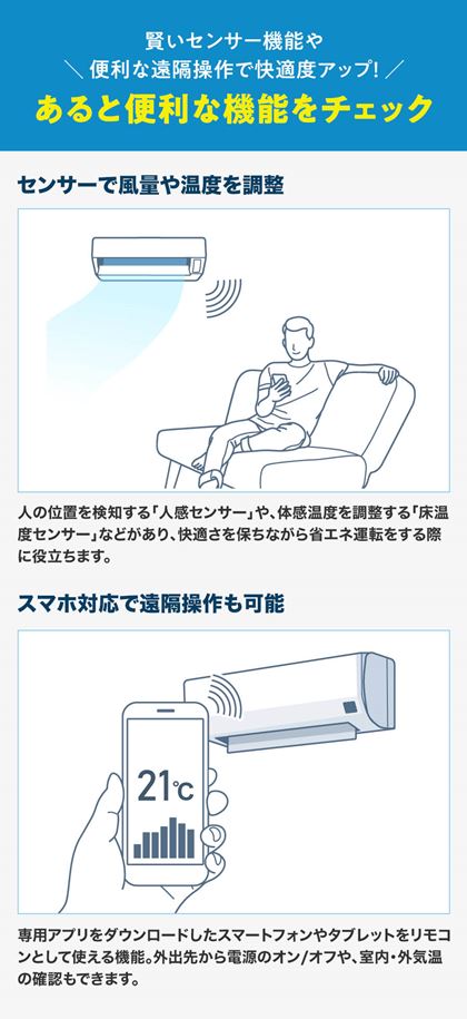 「3」で紹介した自動掃除機能以外にも、搭載されているとうれしい機能はたくさんあります。たとえば、センサー機能は、室内の温度はもちろん、人の位置も検知して効率的に運転してくれたり、スマートフォンのアプリ操作に対応しているモデルであれば、外出先からエアコンをオン/オフしたり、室内温度をコントロールしたりできます。