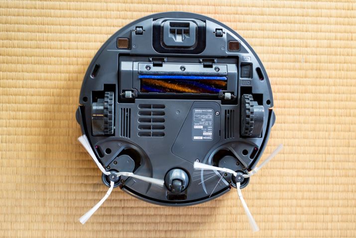 サイドブラシ、回転ブラシ、段差センター、排気口など、掃除に必要な機能が確認できる。こうして見ると、サイドブラシの長さが従来のロボット掃除機のサイドブラシよりもかなり長めになっていることがわかる