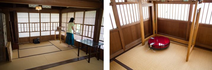 畳のある部屋(上)と廊下(下)との間にある段差は、部屋から廊下へはなんのためらいもなくガンガン進んでいくのに、廊下から部屋へのわずかな段差は乗り越えられず。部屋は部屋、廊下は廊下としっかり分けて掃除した方が効率的