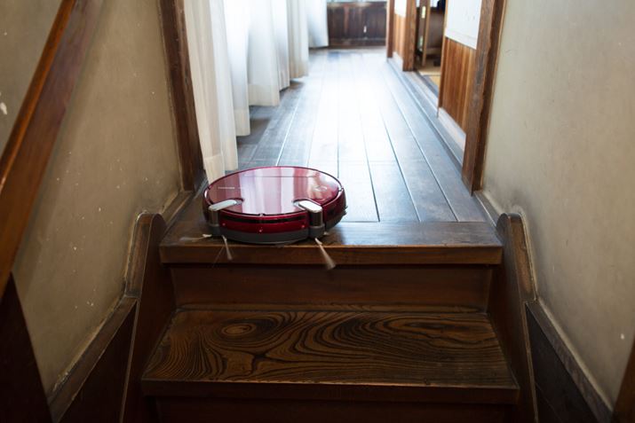 2階の廊下から続く階段。どこまで掃除をするのか、はたまたバランスを崩して落下するのかとじっと見ていたが、サイドブラシの先端ギリギリのところまでやってきて、きちんと掃除をしてから引き返すというスグレモノ