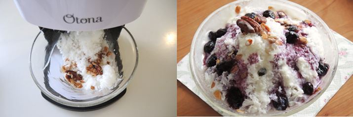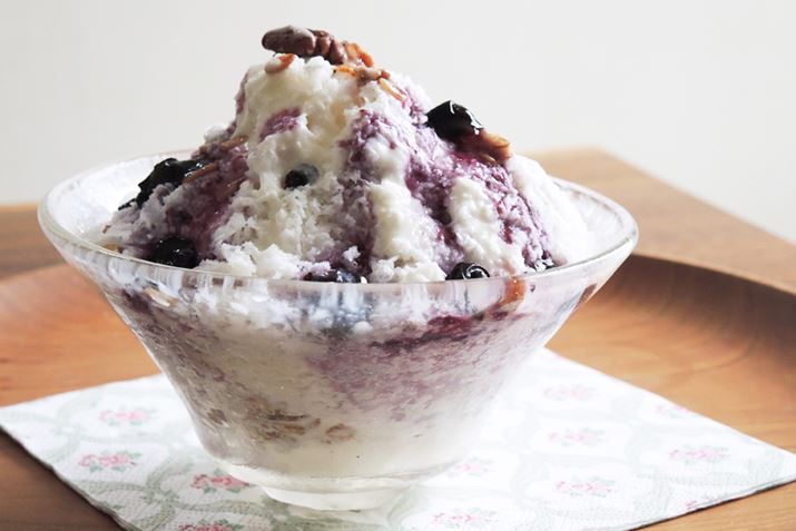 今回は、ドウシシャ「電動ふわふわとろ雪かき氷器 DTY-16BK」を使って、ふわふわでミルキーなかき氷を作ります。牛乳に練乳を加えたミルク氷を削って作るので、まろやかで、キーンと来る感じがありません。上にかけるシロップは、旬のブルーベリーで作るソースと、ヨーグルトソースのミックス。それぞれ甘味の種類が違うので、食べ飽きないんですよ。ここにグラノーラの食感が合わさると、満足感アップ! この組み合わせ、ぜひお試しください。
