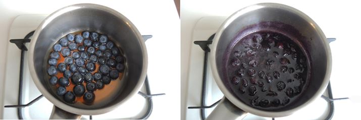(3)鍋にブルーベリーとメイプルシロップを入れて、中火にかけます。