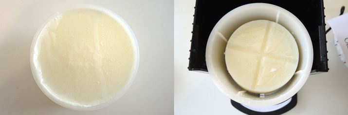 (2)(1)を付属のフタ付製氷カップに入れ、冷凍庫で一晩凍らせれば、ミルク氷のできあがり。
