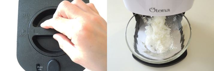 (11)途中で少しグラノーラを加え、氷が無くなるまで削り続けます。器を回しながら落とすと、氷が偏らずに済みますよ。
