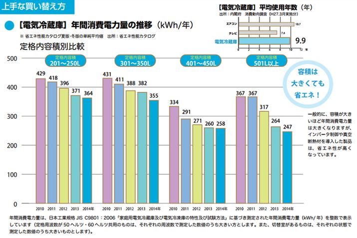 経済産業省 資源エネルギー庁「省エネ性能カタログ2015年夏版」より。ちなみに資源エネルギー庁資料「家庭の省エネ徹底ガイド」によれば、冷蔵庫の電気使用量の割合は、世帯あたりの電気使用量のうち14.2%と家電製品でトップ(「2009年度 家庭部門世帯あたり電気使用量の内訳」)。テレビは8.9%、エアコンは7.4%となっています