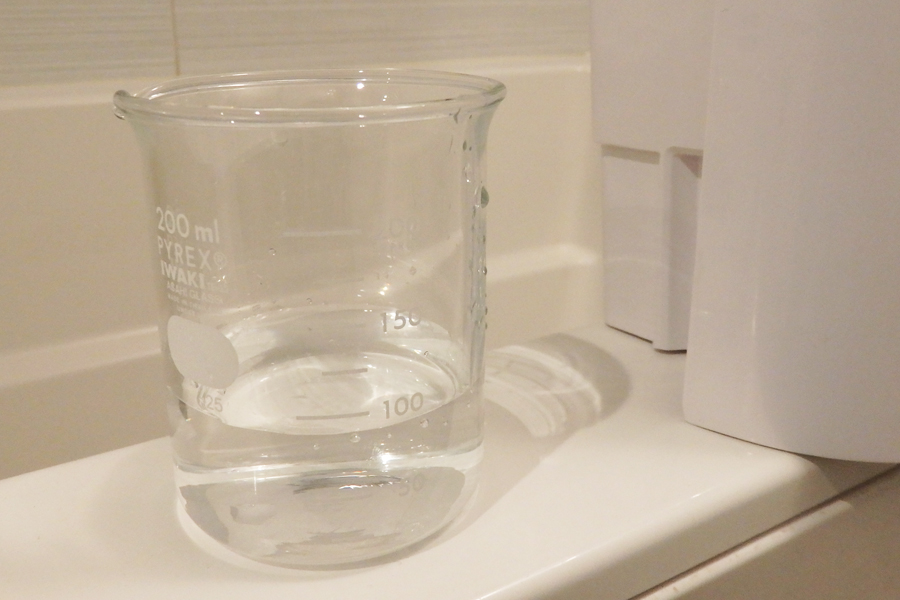 60%程度の湿度になったあとも運転を続け、約3時間で停止させたところ、100ml近い水がタンクに溜まっていた
