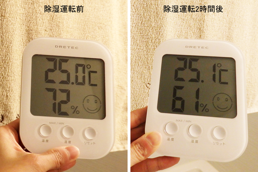 運転開始時72%だった湿度は約1時間後69%まで低下し、2時間後には61%となった