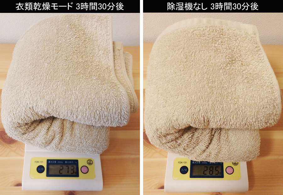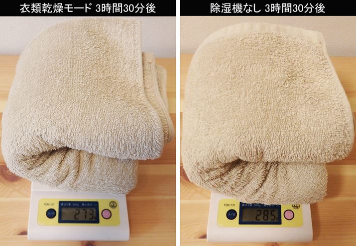 干す前のバスタオルの重量は約426gだったが、ほぼ乾いたと感じた3時間30分後には273gにまで軽減。ちなみに、除湿機を利用しない場合、同時間経過後のバスタオルの重量は285gだった。わずかな差だが、触ってみると湿気が多い感じがする