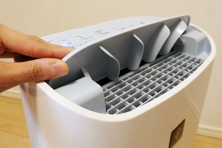 吹出口にあるルーバーは手動で角度調整可能。左右に可動はしないが、幅広く送風できるガイドが施されている。除湿機を使用しない時には、カバーの役割を果たしてくれるのも◎