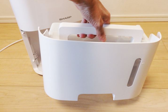 タンクの容量は約2.5L。満水になると自動で運転がストップするので、水が溢れる心配はない。ハンドル付きで排水もラクラク