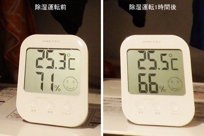 スタート時は71%だった湿度が、約1時間で5%ダウン。3〜26℃の室温では約60%の湿度が適すると言われているが(取扱説明書に記載)、該当する湿度には約2時間で到達した。室温はほとんど上昇していない