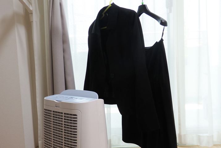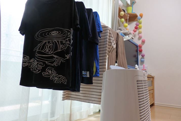 また、コンプレッサー式は消費電力が控えめなところも魅力だ。CV-F71の電気代は「除湿」「衣類乾燥」ともに1時間あたり約4.9円(60Hz)。たとえ、4時間衣類乾燥したとしても19.6円なので、それほど気がねせずに使える。ただし、圧縮機の動作音が少々耳に障るかもしれない(43dB/60Hz)。運転音控えめなモードは搭載されていないため、就寝中に同室で使用するのは少し厳しそう。とはいえ、室内干しの乾くスピードをサポートし、不快なニオイも低減してくれるのは確か。除湿は行わずプラズマクラスターイオンで消臭するモードもあるので、梅雨時期以外にもおおいに利用できるはず。