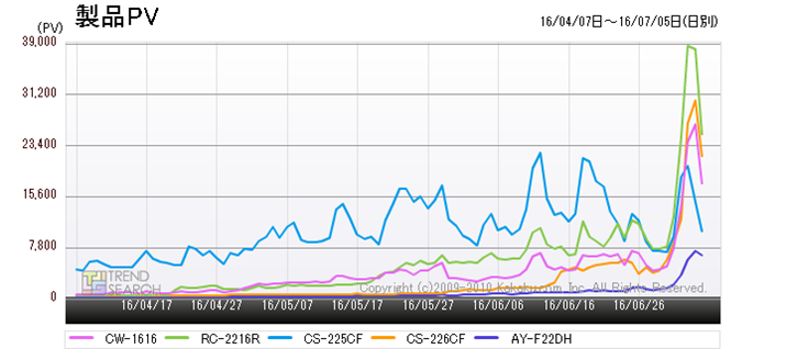 しかも、図7のアクセス数推移で見ると、その注目度の高まりは、昨年モデルをはるかに上回っていることが見て取れる。昨年2015年のピーク時は、「RC-2215R」でもせいぜい6万台/週だったアクセス数が、今年2016年にはすでに「RC-2216R」のアクセス数は倍近い11万台/週に近づいている。窓枠設置型の「CW-1616」についても、明らかに昨年モデルよりもアクセス数を伸ばしており、好調だ。