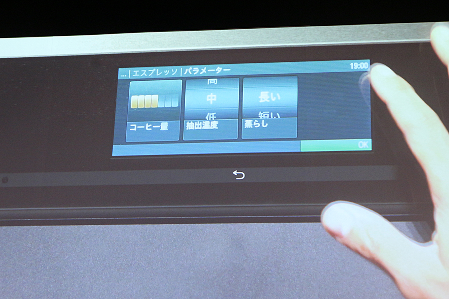 操作は簡単で、スマートフォンのように画面をタッチやスワイプして使用する。大きなディスプレイで文字も読みやすく、設定状況も確認しやすい。温度や蒸らし時間も数値ではなく、「高」「長め」などといった文言で表示されるので、直感的に操作できる。