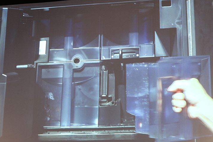 カバーを開くと、コーヒー豆ケース(右上)、水タンク(右下)、ガラ受け(左下)が現れる。コーヒー豆は約500g、水は2.3L、ガラ受けは約15杯分の容量があるという