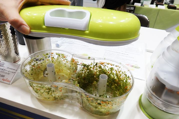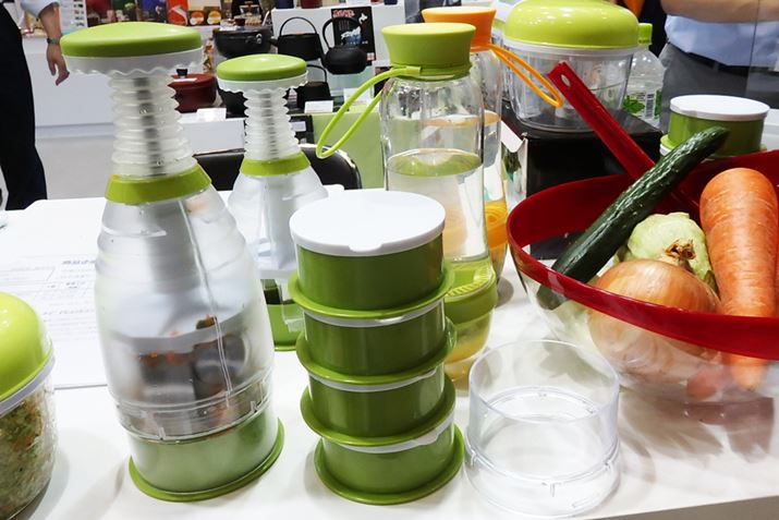 調理で手間がかかる食材のみじん切りは、フードプロセッサーを使えばラクラク♪ ジアレッテのブースには電動ではありませんが、カットした食材を受ける容器が保存容器にもなる「ベジタブルチョッパーコンボボックス」や、レバーを引くだけで刻める「ツインでビュンビュンチョッパー&ブレンダ―」が展示されていました。