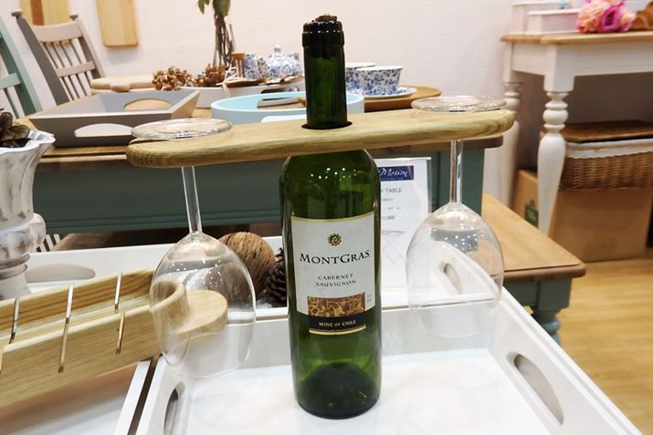 ワインボトルにはめ込んで両サイドにワイングラスをセットできるホルダーは、ただ穴の開いた木のボードなのに利便性は高い!