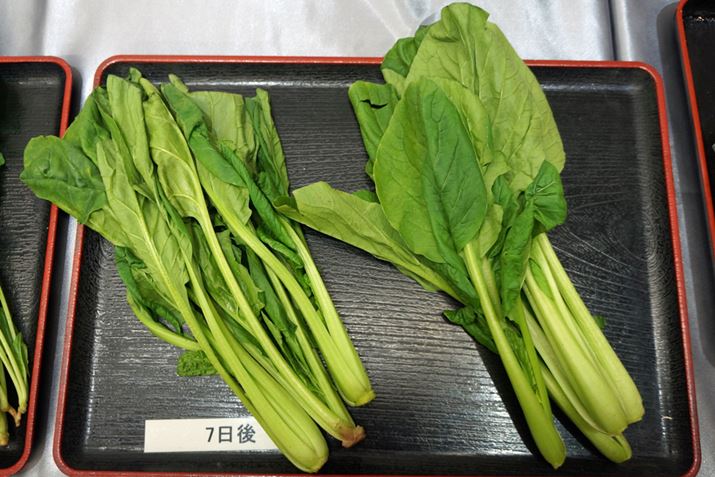 右側のほうれんそうが「朝どれ野菜室」に入れておいたもの。水分の蒸散量が抑制され、葉っぱがみずみずしい!