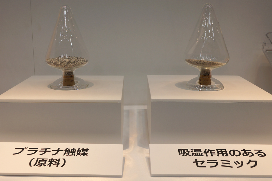新しいプラチナ触媒の中身の展示。プラチナ触媒は、水分を吸収してしまうと約30%程度の力しか出せなくなってしまうという。そこに吸湿作用を持つセラミックを混ぜることで、セラミックが水分を吸収。プラチナ触媒の働きが向上する