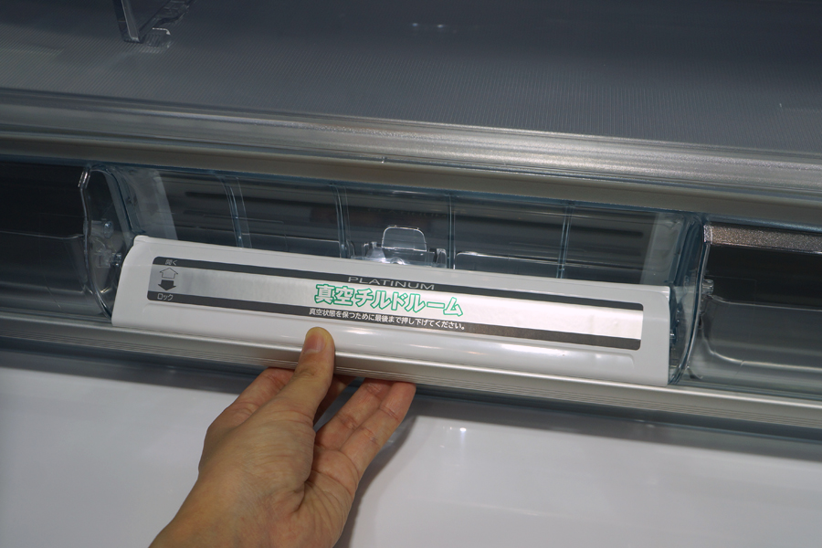 「真空チルド」は、搭載されて今年で10年目となる、日立の冷蔵庫の代名詞とも言える機能だ。チルドルーム内の空気を小型の真空ポンプで吸引しておよそ0.8気圧の真空環境にすることで食品の酸化を抑えるだけでなく、密閉構造によって水分を逃さず乾燥を抑制。また、食材を凍らせないぎりぎりの温度(−1℃)で保存することで、風味や栄養分をキープする。「XGシリーズ」での進化点は、真空能力を高めた新しい真空ポンプが採用(555L以上の機種のみ)されたことと、能力を向上させた新しいプラチナ触媒を採用し、酵素の働きを抑える炭酸ガスの生成量が従来機の約1.5倍になった点。さらに、ハンドルの構造を見直し、開閉がしやすくなった点だ。
