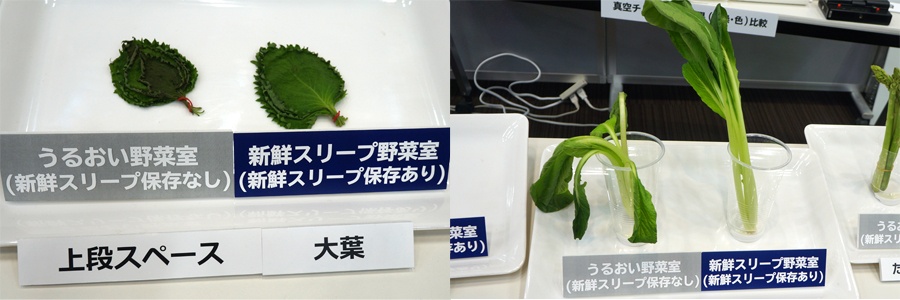通常、大葉は保存期間が長くなると乾燥が進んでまわりがめくれているが、「新鮮スリープ野菜室」で保存したものはみずみずしさをキープしている(写真左)。また、「新鮮スリープ野菜室」で保存した小松菜は3日経っても買ってきたばかりのように新鮮(写真右)。これらの効果は、袋に入れても入れなくても結果は変わらないという