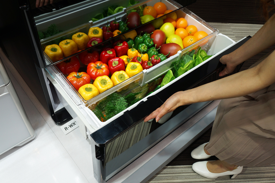 今回の新製品発表会では、「XGシリーズ」よりワンランク上のモデルである「真空チルド WXシリーズ」も同時に発表された。「デリシャス冷凍」「真空チルド」「新鮮スリープ野菜室」といった「XGシリーズ」に搭載された機能に加え、冷凍室下段と野菜室に電動引き出しなどを採用。最上位機種の「R-WX7400G」は、業界最大の735Lという大容量を実現している。