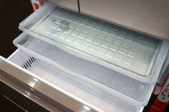 そんな現状を受け、日立は「XGシリーズ」に、手間なくおいしく急冷凍ができる「デリシャス冷凍」を採用した。「デリシャス冷凍」は、庫内に広く浅いアルミトレイを設置したのが特徴。熱伝導にすぐれたアルミトレイが食品の熱をすばやく奪うことで、スピーディーに冷凍できる。急速に冷凍することで氷結晶の成長が抑えられ、食材の細胞の破壊も防げるため、おいしさを損なうことなく、栄養素の残存率も上がるという。従来モデルにも急冷凍用のアルミトレイは設置していたが、トレイが小さく庫内に深さがあったため、食品を重ねて入れてしまうと、その役割を果たせなかったのだが、「デリシャス冷凍」は面積の広いアルミトレイを採用することでこの問題を解消した。