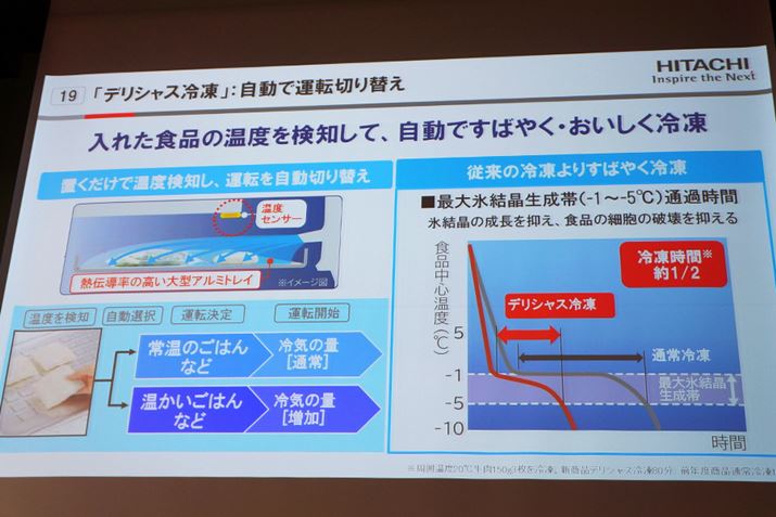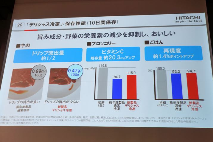 まずは、「XGシリーズ」から新たに搭載される「デリシャス冷凍」について見ていこう。日立アプライアンスの調査によると、日立の冷蔵庫を使用している人の購入の決め手は、「真空チルド」や「新鮮スリープ野菜室」など、食材の鮮度を守る機能が多くの割合を占めており、それらに対する満足度も高い。いっぽうで、多くのユーザーが冷凍した食材の味に不満を感じつつも、「冷凍室が満杯だから」「使い方がわからない」といった理由から、食品の鮮度を保ちながら冷凍ができる急冷凍機能を使用していないという。