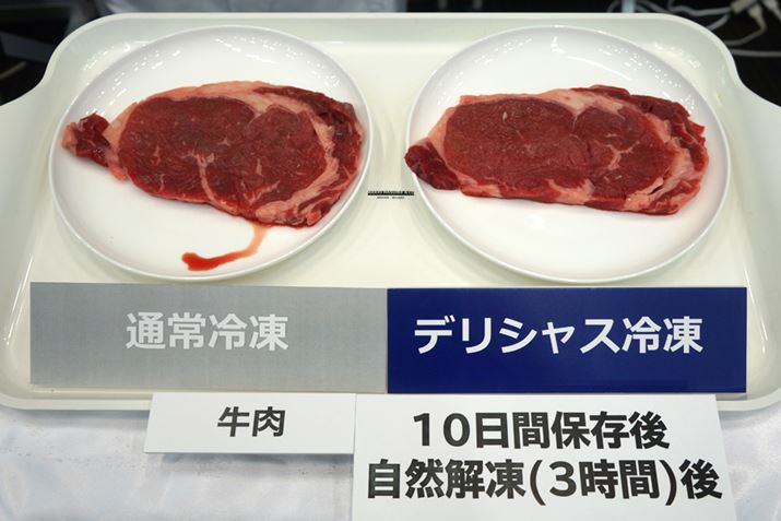 「デリシャス冷凍」と通常冷凍で冷凍させた牛肉を比べたサンプル。右の「デリシャス冷凍」の方はドリップがほんの少しに抑えられている