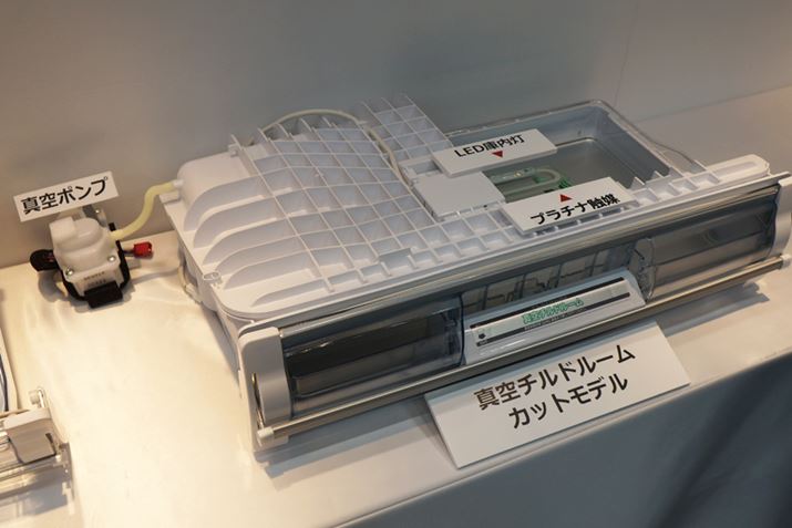 「真空チルド」部のカットモデル。真空ポンプによって気圧の下がったチルドルーム内でプラチナ触媒が炭酸ガスを生成し、食材の酸化を抑えて眠らせるように保存できる