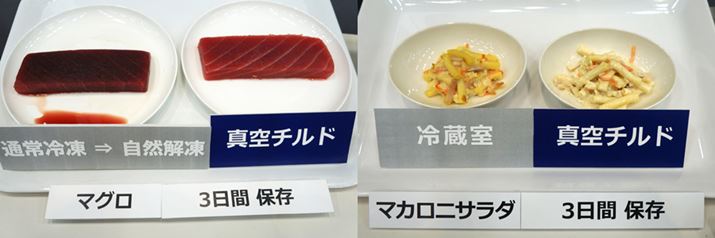「真空チルド」で3日間保存したマグロはほとんど変色なし。凍らせずに保存するため、ドリップも発生しない(写真左)。マカロニサラダも、マヨネーズが酸化せずおいしそうな見た目をキープ。ちなみに、これらの効果はラップをしてもしなくても結果は変わらないという