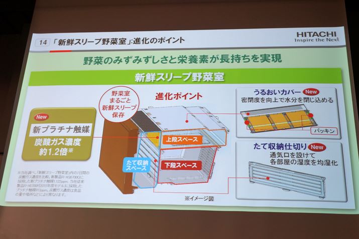 「真空チルド」同様、新しいプラチナ触媒を採用し、炭酸ガスの生成量が1.2倍に増加。また、縦収納仕切りに通気口を設けたことで部屋間で水分の行き来が可能になり、鮮度の劣化をより抑制できるようになった