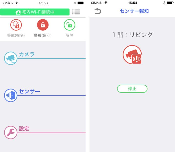 警戒(在宅)と警戒(留守)と解除の3つのモードがあり、アプリから選択できるようになっています。警戒モードにして屋内カメラの前で動くと、スマホにセンサー通知が届くようになります