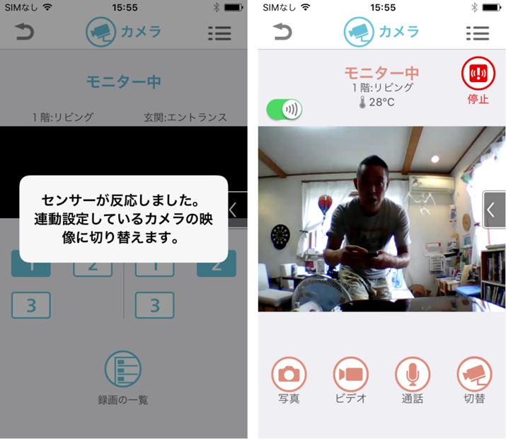 カメラが動きを感知すると、即座にアプリはカメラ映像に切り替わります。この時点でホームユニットは赤い点滅に変わり大きなブザー音が鳴っています!